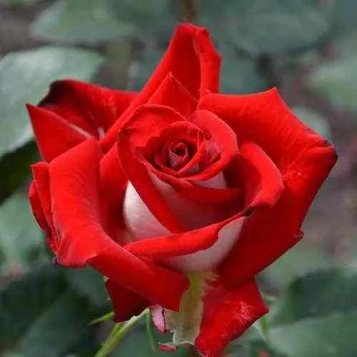 Бело-красные бутоны бокаловидной формы классической розы меняют свой внешний вид в течение цветения. Сначала роза аккуратно свернута, она полностью насыщенно-красная, в полном роспуске бутон приобретает форму умеренно махровой классической розы, демонстрируя свету белоснежную сердцевину.